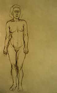 Akt, weiblich, stehend, Vorderansicht, 1941, Maße: 60 x 40 cm, Zeichnung, Braune Kreide auf beigem Karton, Erbengemeinschaft Arndt Reg.Nr.: E41-24/18