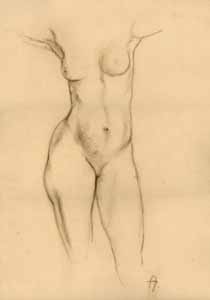Akt, weiblich, stehend, ab Achseln, 1941, Maße: 60 x 38 cm, Zeichnung, Braune Kreide auf beigem Karton, sign. ru "A" Erbengemeinschaft Arndt Reg.Nr.: E41-24/20