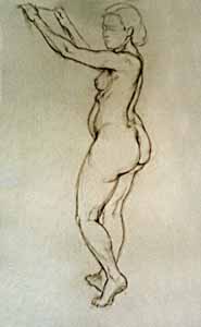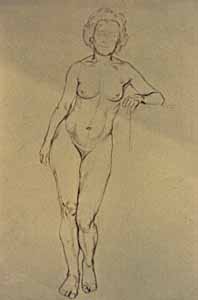 Akt, weiblich, stehend, seitlich angelegt, 1941, Maße: 58 x 40 cm, Zeichnung, Braune Kreide auf beigem Karton, Erbengemeinschaft Arndt Reg.Nr.: E41-24/30-52
