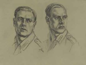 Porträts eines Freundes in Uniform, 1941, Maße: 45 x 60 cm, Zeichnung, Kohle auf grau-grünem INGRES-Büttenpapier, sign. u. dat. um "WA 41" Erbengemeinschaft Arndt Reg.Nr.: Z41-11/20-58