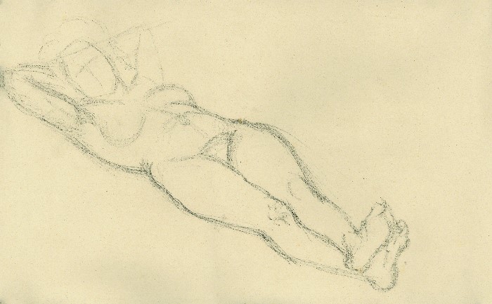 Akt auf dem Rücken liegend, 1942, 27 x 40 cm, Zeichnung; Bleistift auf beigem Ingres-Büttenpapier