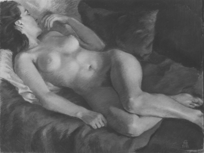 Frauenakt auf Bett liegend, Vorderansicht, 1942, Maße unbekannt Gemälde; Pastell auf Karton