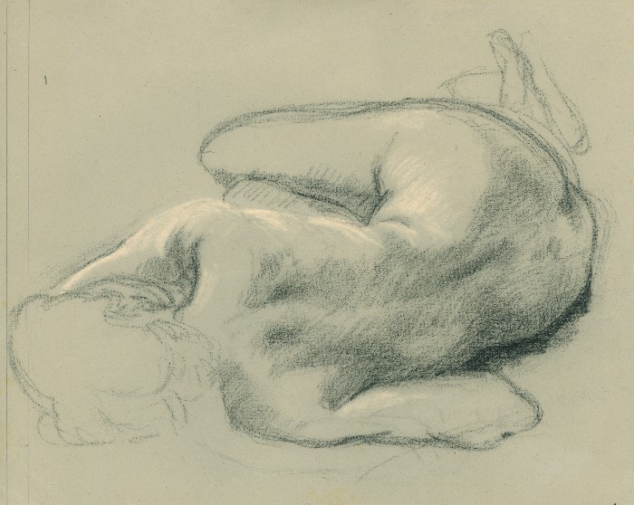 Akt, liegend, Rückenansicht, 1942, 26 x 34 cm, Zeichnung; Bleistift, Kreide auf beigem Karton
