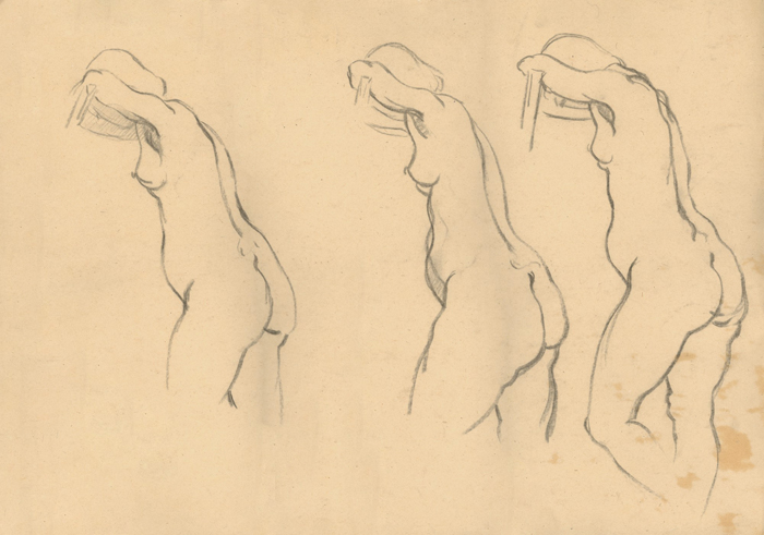 Drei Akte, seitlich stehend, 1943, 43 x 56 cm, Zeichnung, Kohle auf beigem Karton