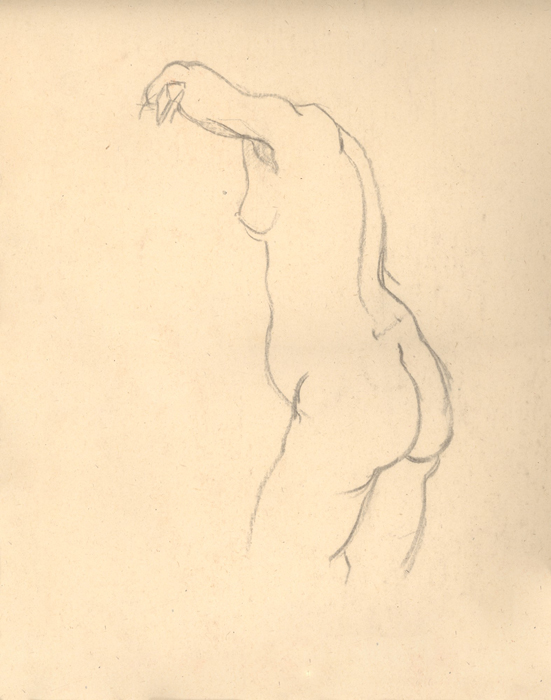 Akt, seitlich stehend, 1943, 34 x 23 cm, Zeichnung, Kohle auf beigem Karton