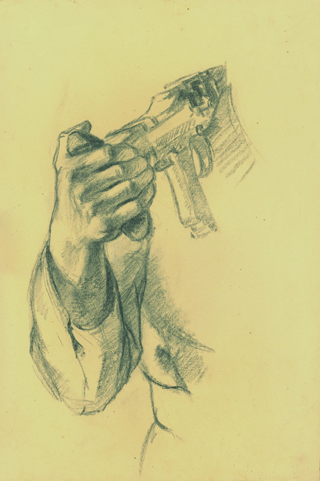 Gewehr mit Hand auf Schulter haltend, 1943, 40 x 30 cm, Zeichnung, Kohle auf grauem Ingres-Büttenpapier