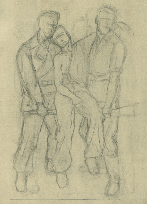 2 Soldaten, einen verwundeten tragend, 1943, 55 x 39 cm, Zeichnung, Bleistift Kohle auf grauem Karton; Entwurf zu einem großen Triptychon für eine Festhalle