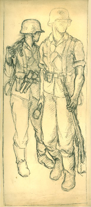 2 Soldaten mit Gewehre und Handgranaten, 1943, 72 x 29 cm, Zeichnung, Bleistift und Kohle auf Karton; Entwurf zu einem großen Triptychon für eine Festhalle