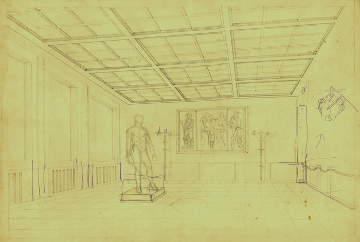Festhalle mit Triptychon 1943, 42 x 61 cm, Zeichnung, Bleistift auf beiges Ingres-Büttenpapier; Skizze der Festhalle mit der Lage des Triptychon an einer Wand