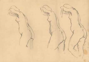 Drei Akte, seitlich stehend, 1943, Maße: 43 x 56 cm, Zeichnung, Kohle auf beigem Karton, Erbengem. Arndt - Reg.-Nr.: E 43 -26/03 - 04