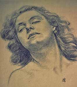 Porträt von A.A. mit geschlossenen Augen, 1943, Maße: 28 x 30 cm, Zeichnung, Kohle auf beigem Karton, sign. u. dat. ru "WA 1943 ", Erbengem. Arndt - Reg.-Nr.: Z 43 - 31/21 - 08