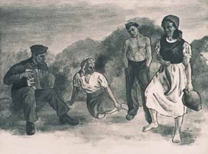 Soldaten mit Bauernmädchen, 1943, Maße unbekannt, Zeichnung, Pastell auf Karton, Verbleib unbekannt, -Abb.: von Foto, Reg.-Nr.: Z 43 - 28/33 - 19