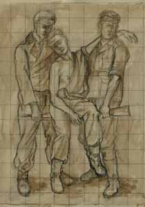 2 Soldaten einen Verwundeten tragend, 1943, Maße: 55 x 39 cm, Zeichnung, Kohle u. Aquarellfarbe auf Zeichenpapier; Entwurf zu einem großen Triptychon für eine Festhalle; Erbengem. Arndt - Reg.-Nr.: E 43 -11/25 - 24