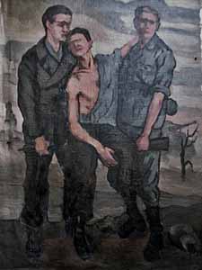 2 Soldaten einen Verwundeten tragend, 1943, Maße: 77 x 56 cm, Gemälde, Öl auf Leinwand, Entwurf zu einem großen Triptychon für eine Festhalle; Erbengem. Arndt - Reg.-Nr.: E 43 -11/19 - 25