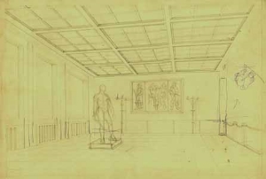 Festhalle mit Triptychon 1943, Maße: 42 x 61 cm, Zeichnung, Bleistift auf beiges Ingres-Büttenpapier; Skizze der Festhalle mit der Lage des Triptychon an einer Wand; Erbengem. Arndt - Reg.Nr.: E43-11/21 -28