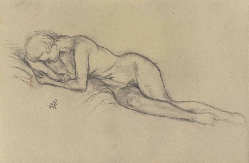 Akt, weiblich, liegend auf Tuch, 1944, 29,5 x 45 cm, Zeichnung, Kohle auf grün-beigem INGRES-Büttenpapier