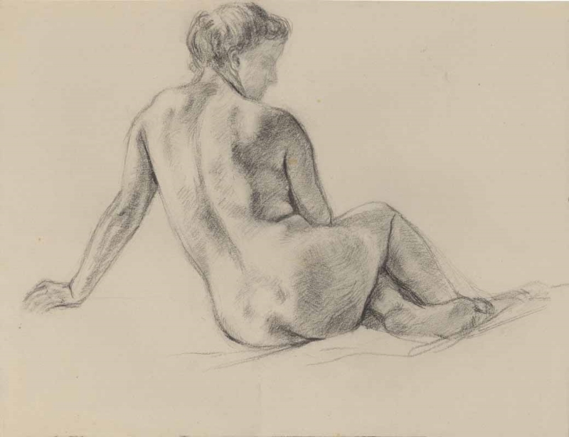 Akt, weiblich, sitzend von hinten, 1944, 30 x 39 cm, Zeichnung, Kohle auf grauem Zeichenpapier