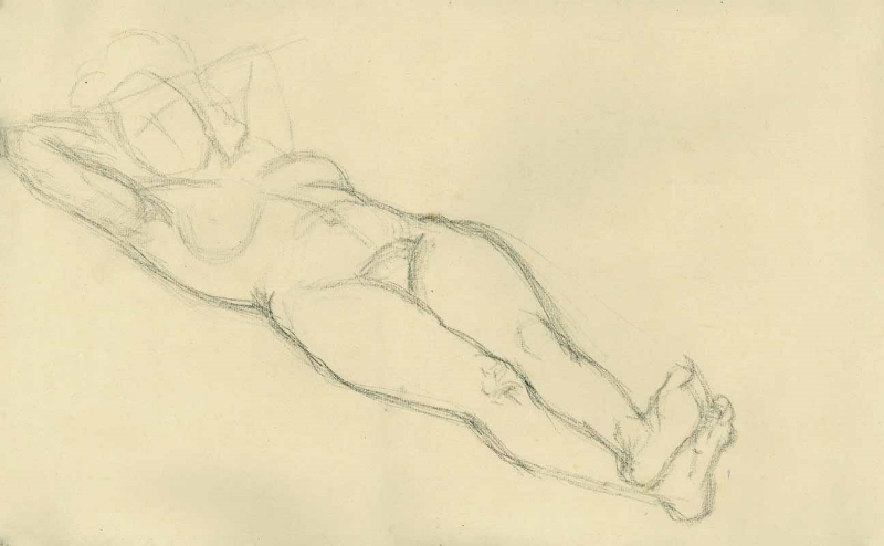 Akt auf dem Rücken liegend, 1944, 27 x 40 cm, Zeichnung; Bleistift auf beigem Ingres-Büttenpapier