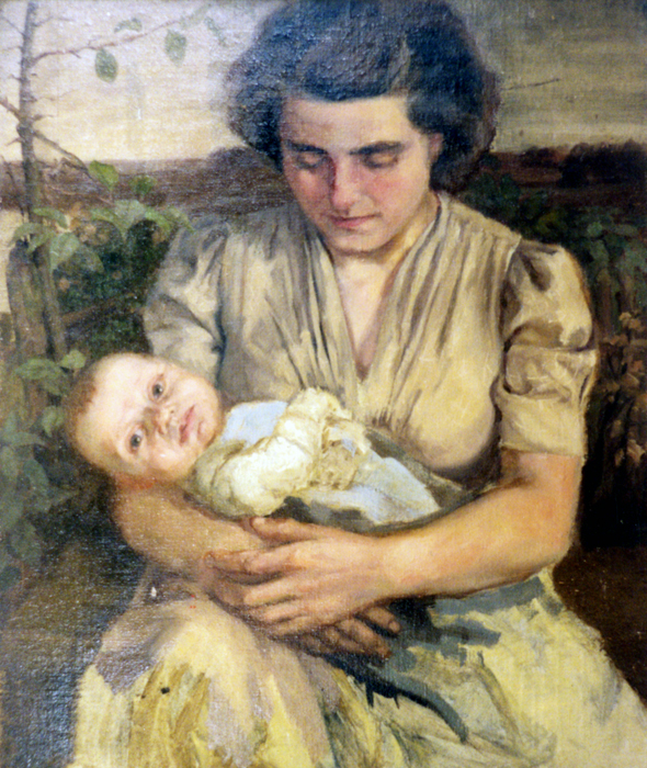 A.A. mit Säugling F. auf dem Arm, 1945, 65 x 54 cm, Gemälde, Öl auf Hartfaserplatte,