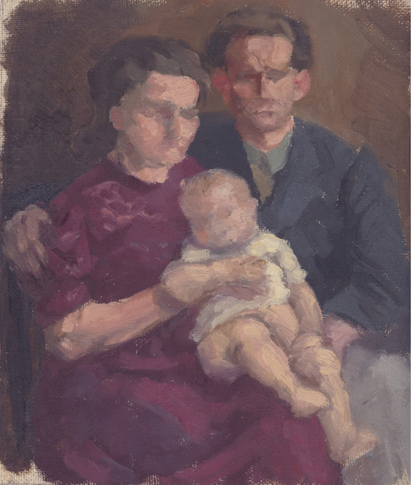 Selbstbildnis mit Frau und Baby F., 1945, 26 x 22 cm, Gemälde, Öl auf Leinwand