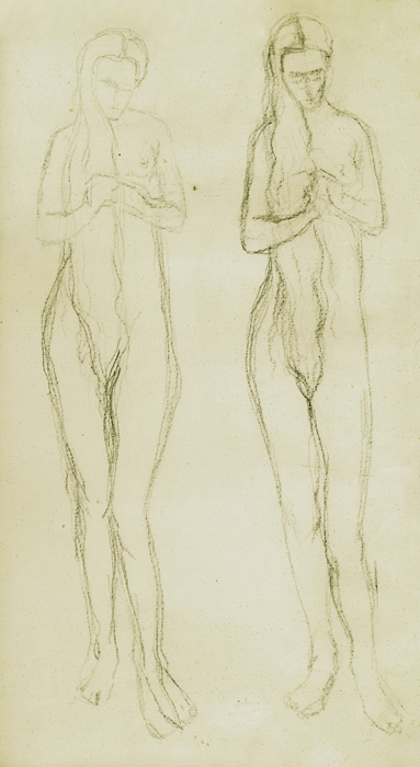Zwei Frauen mit langem Haar, 1946, 55 x 30 cm, Zeichnung, Bleistift auf grau-beigem INGRES-Büttenpapier