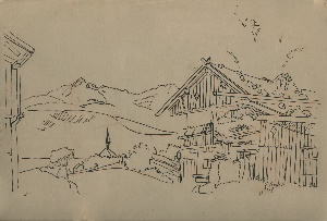 Alpenlandschaft mit Bauernhäuser, 1947, 20 x 30 cm, Zeichnung, Tusche auf grundierter Holzfaserplatte; Erbengem. Arndt - Reg.Nr.: E 46 - 27 / 30 - 03