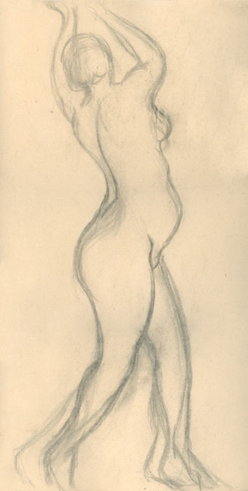 Akt stehend, rechte Seitenansicht mit erhobenen Armen 1948, 60 x 40 cm, Zeichnung, Kohle auf beigem Zeichenkarton