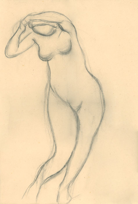 Akt stehend, Vorderansicht mit erhobenen Armen, 1948, 60 x 40 cm, Zeichnung, Kohle auf beigem Zeichenkarton