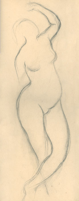 Akt stehend, Vorderansicht mit links gekreuzten Beinen, 1948, 60 x 40 cm, Zeichnung, Kohle auf beigem Zeichenkarton