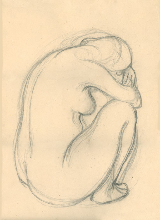 Kauernde (Akt hockend, rechte Seitenansicht), 1948, 52 x 39 cm, Zeichnung, Bleistift auf beigem Zeichenkarton
