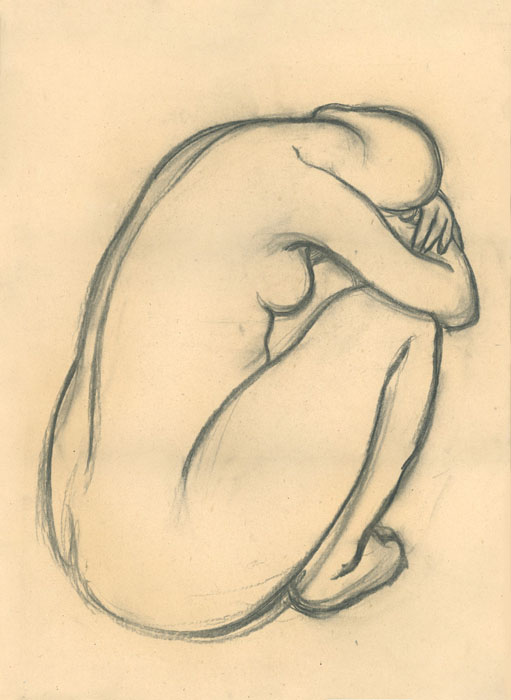Kauernde (Akt hockend, rechte Seitenansicht), 1948, 60 x 41 cm, Zeichnung, Kohle auf beigem Zeichenpapier
