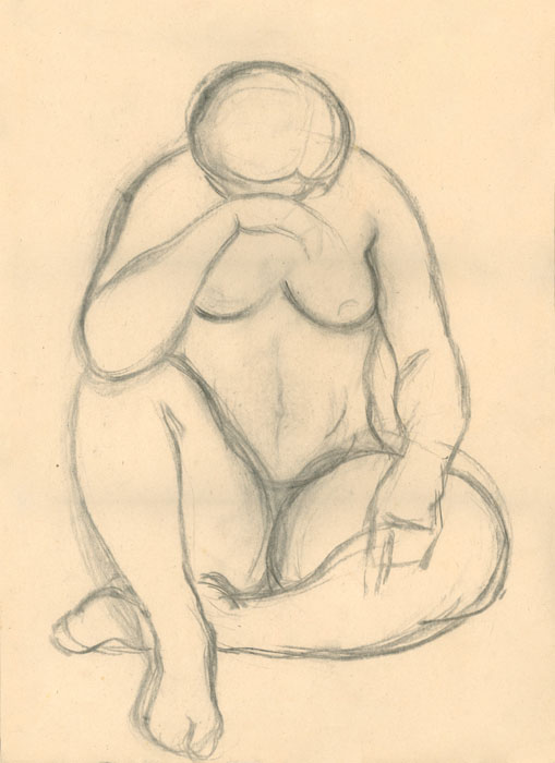 Akt hockend, Vorderansicht, Kopf auf Arm gest ützt, 1948, 60 x 41 cm, Zeichnung, Kohle auf beigem Zeichenkarton
