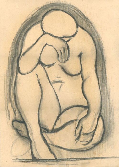 Akt hockend, Vorderansicht, Kopf auf Arm gest ützt, mit Schatten, 1948, 60 x 41 cm, Zeichnung, Kohle auf beigem Zeichenkarton