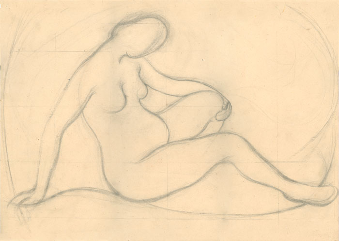 Akt seitlich auf Coach sitzend rechter Arm aufgest ützt, 1948, 60 x 40 cm, Zeichnung, Kohle auf beigem Zeichenkarton