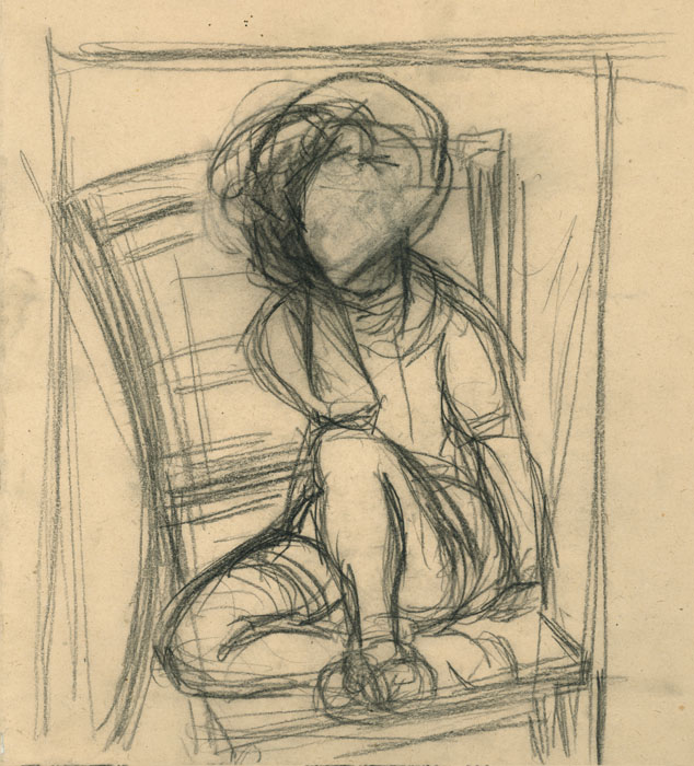 Sohn F. auf Stuhl hockend 1948, 30 x 27 cm, Zeichnung, Kohle auf beigem Zeichenkarton