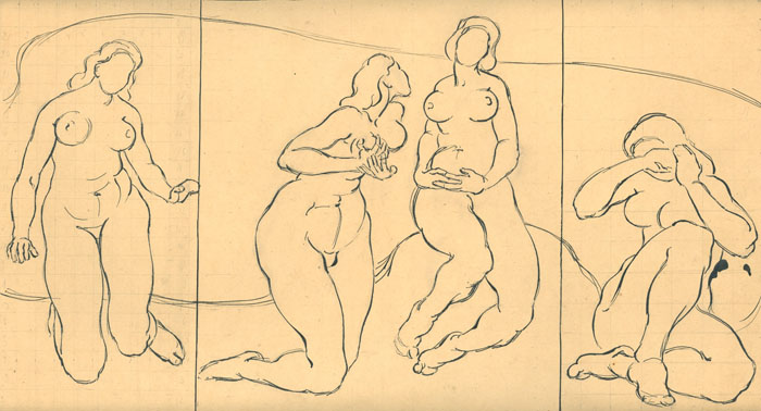 4 Akte (Skizzen zu einem Triptychon "Jahreszeiten"), 1948, 22 x 40 cm, Zeichnung, Tusche auf beigem Zeichenkarton
