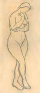 Akt stehend, Vorderansicht mit rechts gekreuzten Beinen, 1948, 61 x 40 cm, Zeichnung, Kohle auf beigem Zeichenkarton; Erbengem. Arndt - Reg.Nr.: Z 48 - 24 / 32 - 05