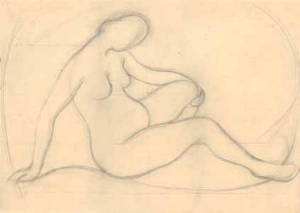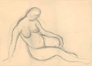 Akt seitlich sitzend rechter Arm aufgestützt, 1948, 58 x 40 cm, Zeichnung, Kohle auf beigem Zeichenkarton; Erbengem. Arndt - Reg.Nr.: Z 48 - 24 / 08 - 11
