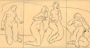 4 Akte (Skizzen zu einem Triptychon "Jahreszeiten"), 1948, 22 x 40 cm, Zeichnung, Tusche auf beigem Zeichenkarton, Erbengem. Arndt - Reg.Nr.: Z 48 - 23 / 30 - 16