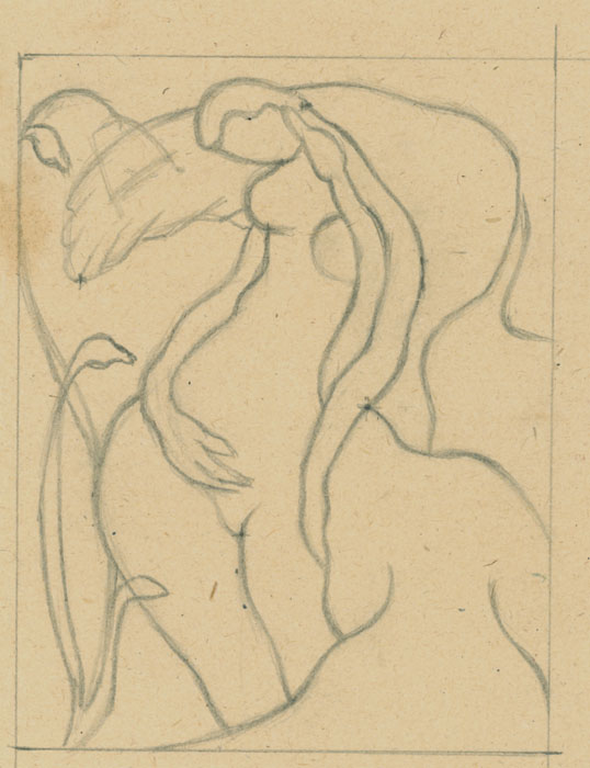 Leda mit Schwan; 1949, 13 x 10 cm, Zeichnung, Bleistift auf beigem Zeichenkarton; ( Entwurf für einen Holzschnitt)