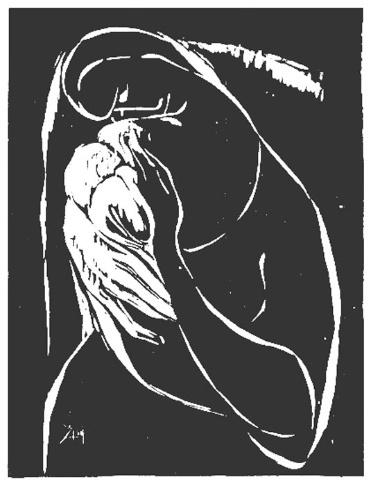 Mutter mit Kind II; 1949, 38 x 30, cm, Druckgrafik: Holzschnitt, Aufl.: 25, Platten: 1, handgedruckt auf Japan- und Büttenpapier