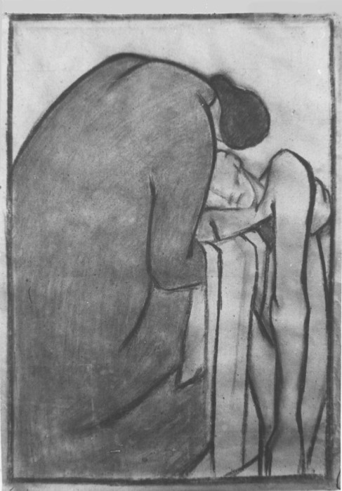 Pieta; 1949, ca. 140 x 100 cm, Zeichnung, Kohle, Kreide auf Packpapier; Studie zu einem Ölbild