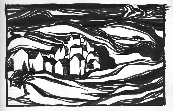 Eisenbach expressionistisch; 1950, 22 x 34 Cm,,Zeichnung, Tusche auf beigem Büttenpapier