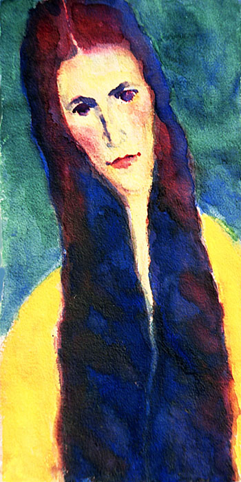 Frau mit langem rot-blauem Haar (Frau G.W.); 1950, 60 x 33 cm, Aquarell auf beigem Büttenpapier