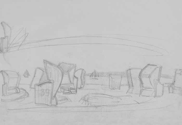 Strandkörbe am Meer; 1953, 20 x 32 cm, Zeichnung, Bleistift auf beigem Japanpapier