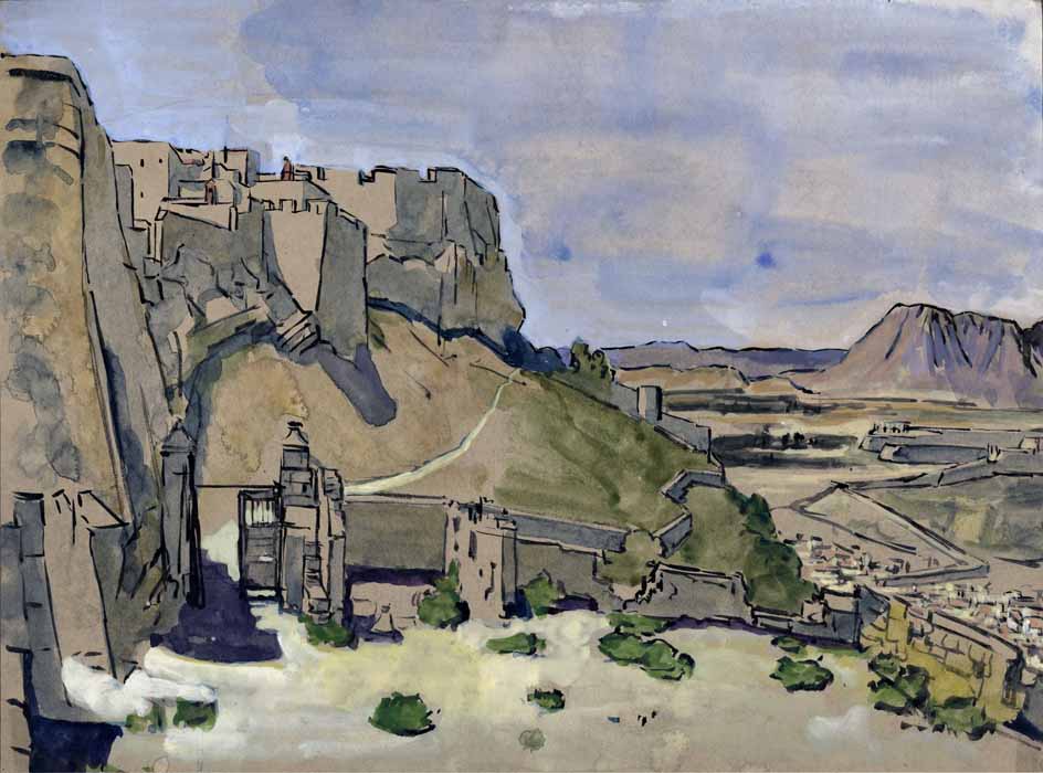 Marrokanische Stadt mit Stadtmauern, 1954, 44 x 59 cm, Zeichnung, Aquarell / Tempera auf beigem INGRES-Büttenpapier