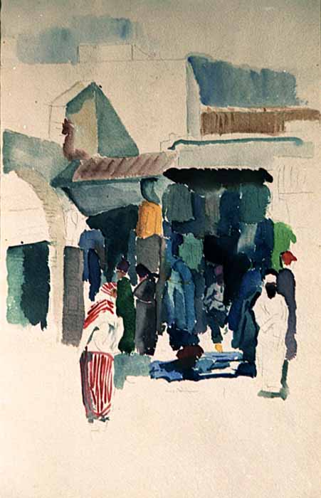 Kleidersouk in Tanger, 1954, 40 x 29 cm, Zeichnung, Aquarell auf beigem Büttenpapier