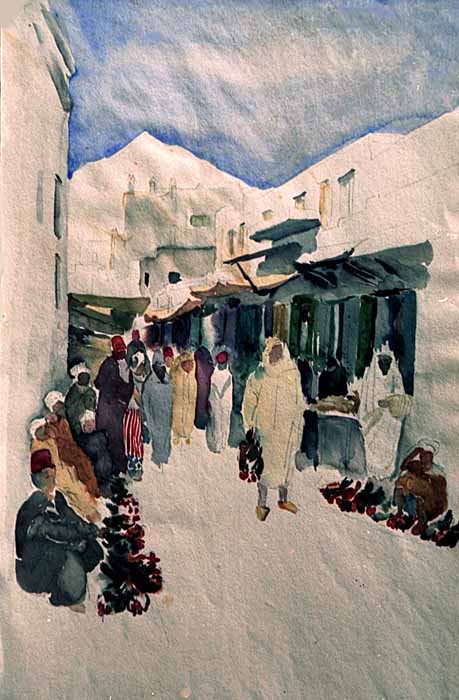 Souk in Tetuan (Hühnerviertel), 1954, 44 x 30 cm, Zeichnung, Aquarell auf beigem Büttenpapier