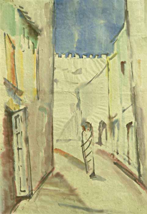 Straße in Tetuan mit verschleierter Fr, 1954, 48 x 34 cm, Zeichnung, Aquarell auf Japanpapier