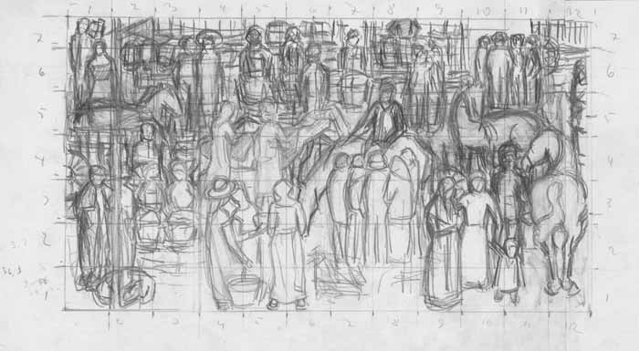 Wandteppichentwurf-Marktplatzszene, 1954, 21 x 36 cm, Zeichnung, Bleistift auf Zeichenpapier